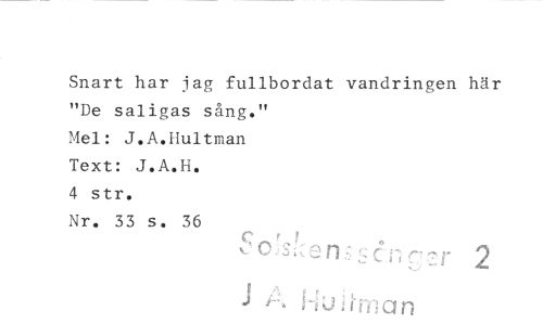 //// Snart har jag fullbordat vandringen här "De saligas sång." //// Mel: J.A.Hultman Text: J.A.H. //// 4 str. //// Nr. 33 s. 36 //// 2 //// -* ^ nnan