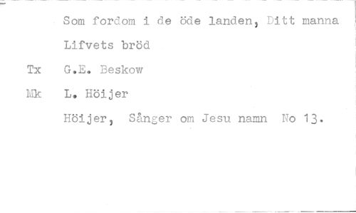 //// Som fordom i de öde landen, Ditt manna Lifvets bröd G.E. Beskow L. Höijer //// Höijer, Sånger om Jesu namn No 13.