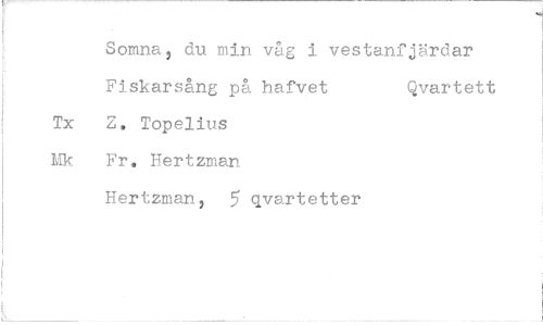 //// Somna, du min våg i vestanfjärdar Fiskarsång på hafvet Qvartett //// Tx Z. Topelius Mk Fr, Hertzman //// Hertzman, 5 qvartetter