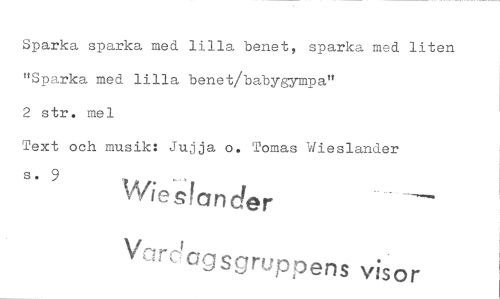 //// Sparka sparka med lilla benet, sparka med liten "Sparka med lilla benet/babygympa" //// 2 str. mel //// Text och musik: Jujja o. Tomas Wieslander s. 9 //// Wtesfancfer //// Vare' //// visor