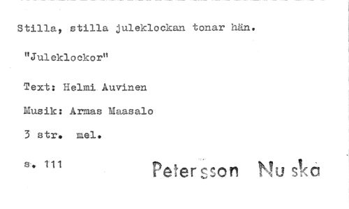 //// Stilla, stilla julekloekan tonar hän. //// "Juleklockor" //// Text: Helmi Auvinen Musik: Armas Maasalo 3 str. mel.