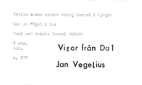 //// Stilla susar vinden kring torpst i Lyngan //// Som en fågel i bur //// Text och nusik: Gunnel Volden //// Li^' Visor från Dal //// s. 230 //// Jan VegeLius