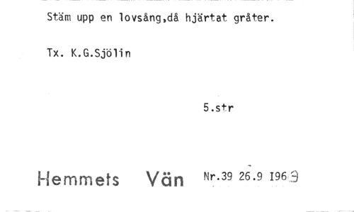 //// Stäm upp en lovsång,då hjärtat gråter. Tx. K.G.Sjölin //// 5.str //// Hemmets Vän ^ 1963