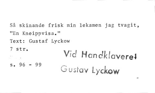 //// Så skinande frisk min lekamen jag tvagit "En Kneippvisa." //// Text: Gustaf Lyckow 7 str. , //// vtd HcnJkfaverel //// s. 96 - 99 //// Gustav Lyckow