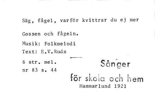 //// Säg, fågel, varför kvittrar du ej mer //// Gossen och fågeln. //// Musik: Folkmelodi Text: E.V.Ruda //// 6 str. mei. Sånoer //// nr 83 s. 44 //// för sko^a och hem //// Hammarlund 1921