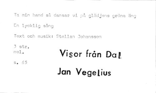 //// Ta min hand så dansar vi på glädjens grdna äng En lycklig sång //// Text och musik: Stellan Johansson //// 3 str. mel. //// s, 65 //// Visor från Da[ Jan Vegetlus