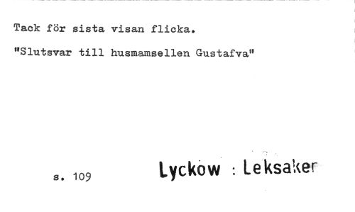 //// Tack för sista visan flicka. //// "Slutsvar till husmamsellen Gustafva" //// Lyckow : Leksaker