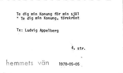 //// Te dig min Konung fBr min själ " le dig min Konung, törekrönt //// Tx: Ludvig Appelberg //// 4, str. //// mrnets vän 1978-05-05