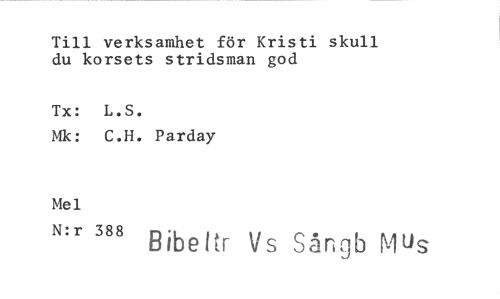 //// Till verksamhet för Kristi skull du korsets stridsman god //// Tx: L.S. //// Mk: C.H. Parday //// Mel //// N.r 388 ^ Sångb M^s