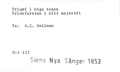 //// Triumf i höga tonen Fridsfursten i sitt majestät //// Tx: A.C. Hallman //// N:r 123 //// Sicns Nya Sånger 1853