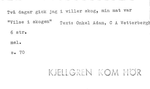 //// Två dagar gick jag i viller skog, min mat var //// "Vilse i skogen" Text: Onkel Adam, C A Wetterberg]: //// 6 str. mel. s. 70 //// KJELL //// "s //// N KOA //// R