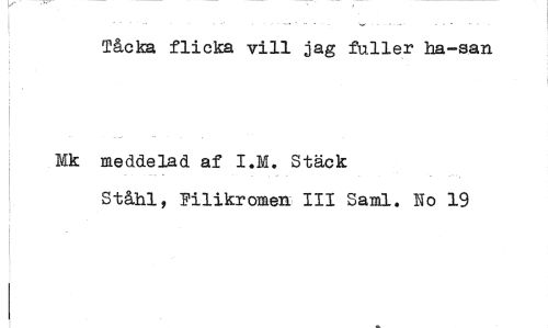 //// Tåcka flicka vill jag fuller ha-san //// meddelad af I.H. Stäck //// Ståhl, Filikromen 111 Sami. No 19