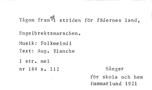//// Tågom framti striden //// Engelbrektsmarschen. //// Musik: Folkmelodi Text: Aug. Blanche //// 1 str. mel nr 184 s. 112 //// för fädernes land, //// Sånger //// för skola och hem Hammarlund 1921