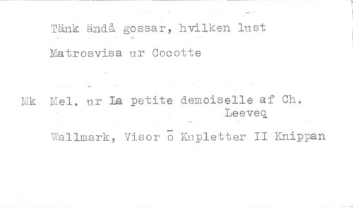 //// Tänk ändå gossar, hvilken lust Matrosvisa ur Cocotte //// Mel. ur Ia petite demoiselle af Ch. //// Leeveq. //// Wallmark, Visor ö Kupletter II Knippan