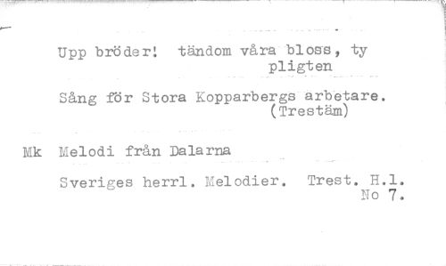 //// Upp bröder! tändom våra bloss, ty //// pligten //// Sång för Stora Kopparbergs arbetare. //// (Trestäm) //// Melodi från Dalarna //// Sveriges herrl. Melodier. Trest. H.l //// No 7