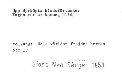 //// Upp dyrköpta blodsförvanter Tagen mot er konung blid //// Mel.ang: Hela världen fröjdes herran N:r 17 //// Sions Nya Sånger 1853