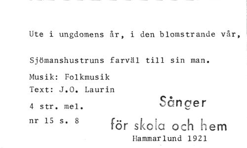 //// Ute i ungdomens år, i den blomstrande vår, //// Sjömanshustruns farväl till sin man. //// Musik: Folkmusik Text: J.O. Laurin //// 4 str. mel. ^QHCer //// nr 15 s. 8 f -* ! ! L ! //// ror skc^a och hem //// Hammarlund 1921
