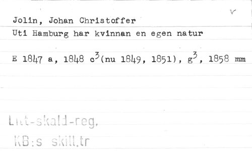 //// V //// Jolin, Johan Chris toffer //// Uti Hamburg har kvinnan en egen natur //// E l8J^7 a, l8!^8 c^(nu 18^9, I83D, 1858 mm //// b //// -T, //// P C ; b //// !j-r:g, //// ikiH.tr