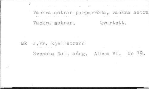 //// Vackra astrar purpurröda, vackra astra Vackra astrar. Qvartett. //// J.Fr. Kjellstrand //// Svenska Na t. sång. Album VI. No 79.