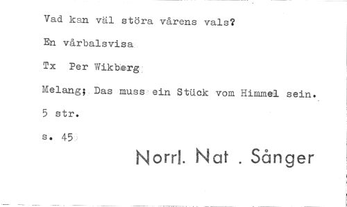 //// Vad kan väl störa vårens vals? //// En vårbalsvisa Tx Per Tikberg //// Melang; Das muss ein Stuck vom Himmel sein. 5 str. //// s. 45 //// Norr!. Nat . Sånger