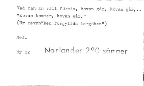 //// Vad man än vill företa, kovan går, kovan går, "Kovan kommer, kovan går." //// (Ur revyn"Den förgyllda lergöken")