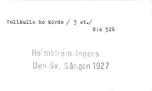 //// Vallkulla ho körde / 3 st. //// /N:o 526 //// Ho'mstrdm-inoers Den Sv. Sången 1927