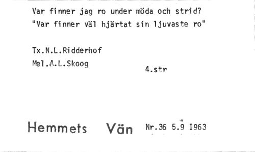 //// Var finner jag ro under möda och strid? "Var finner väl hjärtat sin ljuvaste ro" //// Tx.N.L.Ridderhof Mel.A.L.Skoog //// 4.str //// Hemmets Van "' K 5-91^3