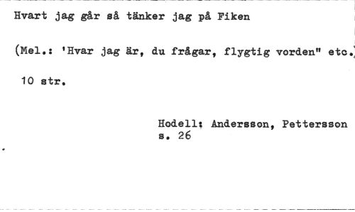//// Hvart jag går så tänker jag på Fiken //// (Mel.: 'Hvar jag är, du frågar, flygtig vorden" etc. 10 str. //// Hodell: Andersson, Pettersson s. 26