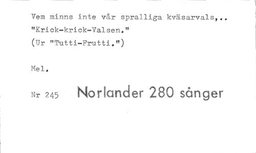 //// Vem minns inte vår spralliga kväsarvals,.. "Krick-krick-Valsen." //// (Ur "Tutti-Frutti.") //// Mel. //// Nr 245 Nor!ander 280 sånger