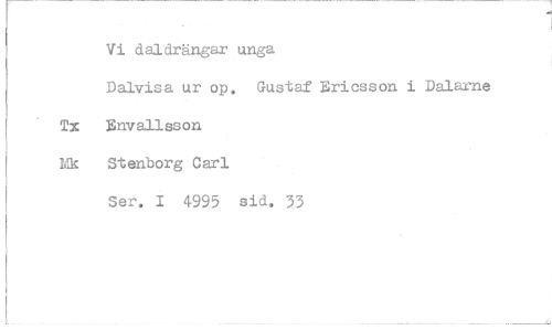 //// Vi daldrängar unga //// Dalvisa ur op. Gustaf Ericsson i Dalarne Tx Envall sson Mk Stenborg Carl //// Ser, I 4995 sid. 33