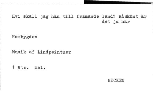 //// Hvi skall jag hän till främande land? så skönt //// det ju här //// Hembygden //// Musik af Lindpaintner 1 str. mel. //// NECKEN