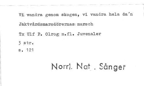 //// Vi vandra genom skogen, vi vandra hela da' Jaktvårdsmarodöremas mars ch Tx Ulf P. Olrog m.fl. Juvenaler //// 3 str. s. 121 //// Norr!. Nat . Sånger