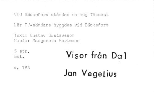 //// Vid Bäcksfors ståndar en hög TV-nast //// När TV-sändare byggdes vid Bäckefors //// Text: Gustav Gustavsson ilusik: Margareta Hartnann //// mei^' Visor från Dal //// s. 198 //// Jan Vege[ius