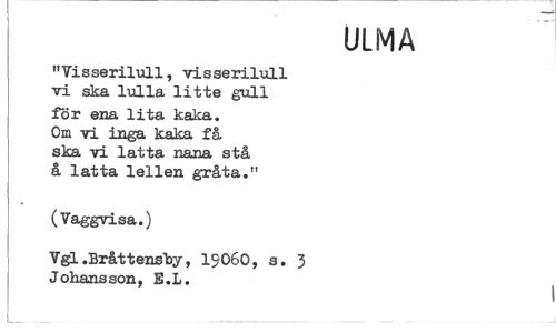 //// "Visserilull, visserilull vi ska lulla litte gull för ena. lita kaka. //// Om vi inga kaka få ska vi latta nana stå å latta lellen gråta." //// (Vaggvisa.) //// Vgl.Bråttenshy, 1^060, s. Johansson, E.L. //// ULMA