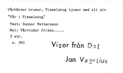 //// Vårbäckar brusar, Tisselskog tjusar med all sin //// "Vår i Tisselskog" //// Text: Gunnar Pettersson //// Mel: Vårvindar friska... //// 3 str. //// s. 340 //// Visor från D31 Jan