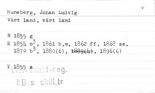 //// Runeberg, Johan Ludvig //// Vånt land, vårt land N I855 g //// E 185^ o^, 1861 b,m, 1862 ff, 1868 ss, 1870 b3, 1880(6), 1896(6)