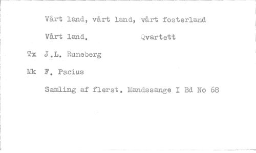 //// Vårt land, vårt land, vårt fosterland //// Vårt land, Qvartett //// Tx J.L. Runeberg Mk F. Pacius //// Samling af fl er st. Mandssange I Bd No 68