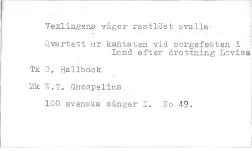 //// Vexlingens vågor rastlöst svalla- //// Qvartett ur kantaten vid sorgefesten i //// Lund efter drottning Lovisa //// I //// Tx B. Hallbäck Hk W.T. Gnospelius //// 100 svenska sånger I. No 49.