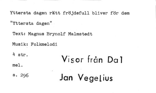 //// Yttersta dagen rätt fröjdefull bliver för dem "Yttersta dagen" //// Text: Magnus Brynolf Malmstedt Musik: Folkmelodi 4 str. //// mel. //// Visor från Dal