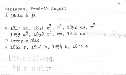 //// Dahlgren, Fredrik August Å jänta å ja //// E 18^7 xx, 1851 g^, i^, 1852 uu, 1853 a3, 1858 mm, l86l nn i F Ånrep e, /^^- //// N l8i[2 f, 1852 b, 1854 b, 1873 a