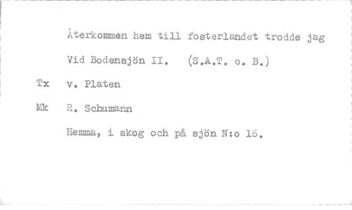 //// Återkommen hem till fosterlandet trodde jag Vid Bodensjön II. (S.A.T. o. B.) //// Tx v. Flaten Mk R. Schumann //// Hemma, i skog och på sjön N:o 16.