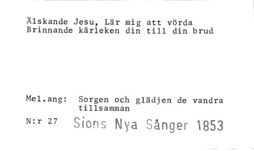 //// Älskande Jesu, Lär mig att vörda Brinnande kärleken din till din brud //// Mel.ang: Sorgen och glädjen de vandra tillsamman //// N-r 27 Sions Nya Sånger 1853