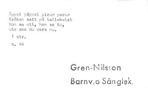 //// Äppel päppel pirum parum Kråkan satt på tallekvist Hon sa ett, hon sa tu, ute ska du vara nu. //// 1 str, //// s. 44 //// Grert-N iisson Barnv.o Sångiek.