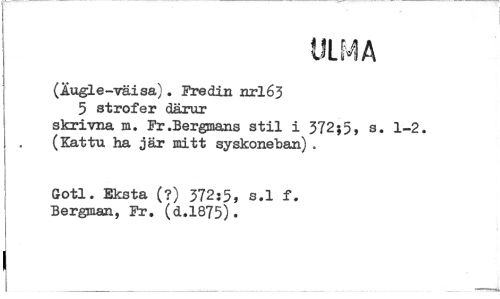 //// (Äugle-väisa). Fre din nrl63 //// 5 strofer därur skrivna m. Fr .Bergmans stil i 372;5, s. 1-2. (Kattu ha jär mitt syskoneban) . //// Gotl. Eksta (?) 372:5, s.l f. Bergman, Fr. (d.1875).