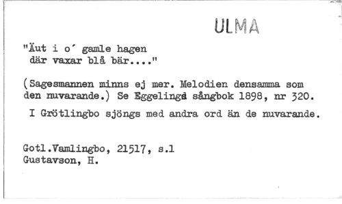 //// "Äut i o' gamle hagen där vaxar hlå här..." //// (Sagesmannen minns ej mer. Melodien densamma som den nuvarande.) Se Eggelingå sångbok 18$8, nr 320. //// I Grötlingbo sjöngs med andra ord än de nuvarande. //// Gotl.Vamlingbo, 21517, s.l Gustavson, H.