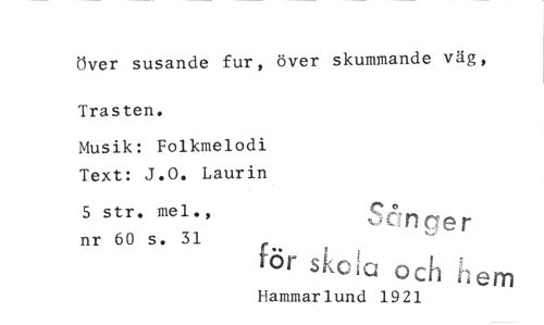 //// över susande fur, över skummande väg, //// Trasten. //// Musik: Folkmelodi Text: J.O. Laurin //// 5 str. mel., C^ //// vinner //// nr 60 s. 31 //// *Ör sko!a och h //// Hammarlund 1921 //// em