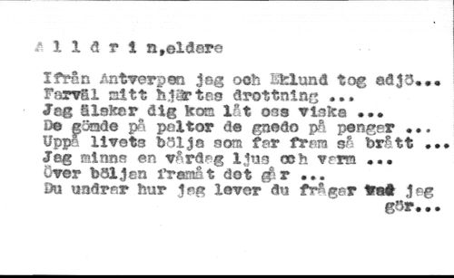 ä % 1 d r 1 n.oldero //// Ifrån /.ntverpen jeg och Eklund tog adjö... Farvfil sitt hiartrs drottning ... //// Jag S Iskar dtg kos låt oos vinka ... öe pösde p& peltor da gnodo på pengar ... Uppå livats balja som far fram så brått ... Jag minns en vårdag ljus och vrrm ... wer böljan freaät dot # r ... //// Du undrar hur Jag lever du fråga* 1mI jag //// gör...