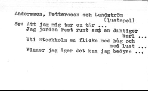 Andersson, Pettersson och Lundström //// _ .. C lustspel) //// oe: «tt jag mig tur ©n t''r ... //// Jag jordan rest runt sa$ en du k t i ger //// karl //// Stt Stockholm en flicka ned håg och //// mod lust //// Tänner jag Sger det ken Jag bedyra .