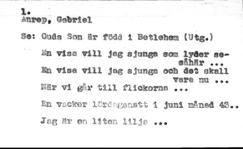 1. //// imrep, Gabriel //// Ses öuös Son Sr tMå 1 Betlehes (Utg.) //// ^b. rlsa vill jag s junga son? lyder se- //// såhSr ... //// Sn visa vill jag sjunga och det ekall //// vara nu ... //// Här vi gfir till flickorna ... //// vacker XCrdagsnatt i juni aånad 4S.. Jsg nv en liten lilja ...