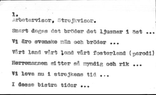 1. //// ^rbetervlsor, struj' visor. //// Sncrt degas öet breder det ljusnar 1 nst ... Vi tro svenske min och brMor ... //// Vfirt land vårt land vårt fosterland (p-erodl} Harresannen sitter aå nynål» ooh rik ... //// Vi levs nu 1 strejkens tiå .., //// I dess© bistra tider ...